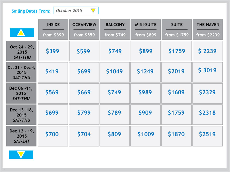 Fares shown are in U.S. dollars and are per person, based on double occupancy or as per the number of guests selected. Government taxes, fees, port expenses, and fuel supplement (where applicable) are additional.
