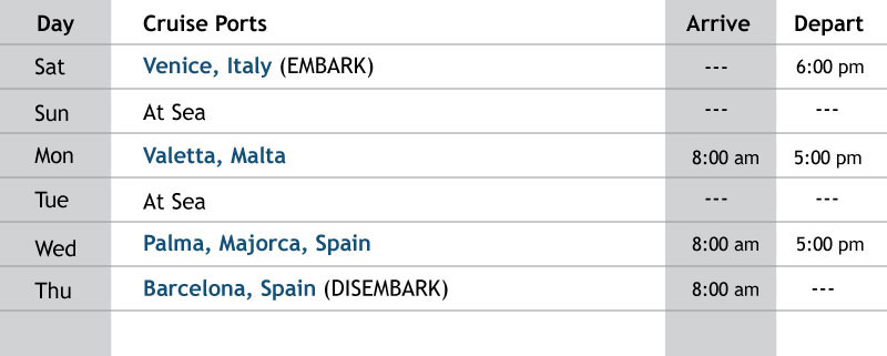 Get to know the beauty of the Mediterranean on this 5-day sailing. Depart from one of the most beautiful cities in the world, Venice, for an escapade you'll never forget. Discover the best of beautiful Malta with a walking tour in Valletta. Then arrive in Barcelona, Spain to experience stunning historical architecture at the end of your cruise.